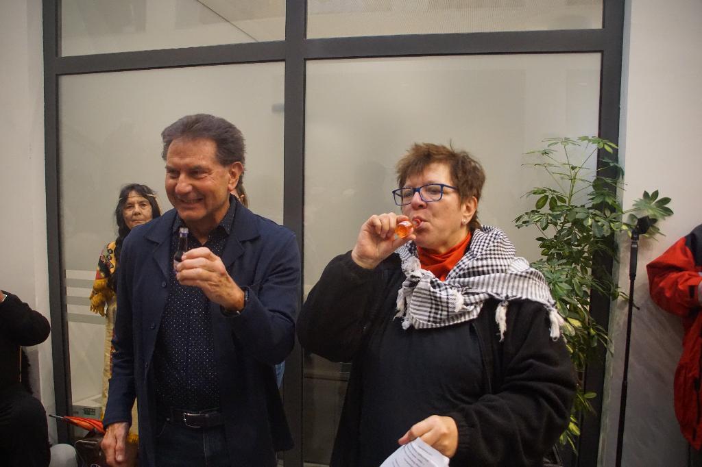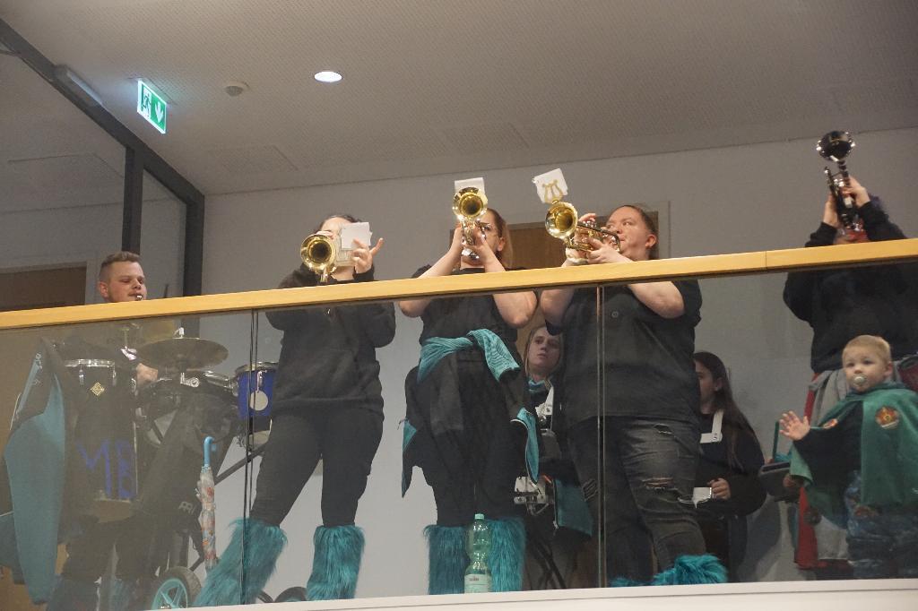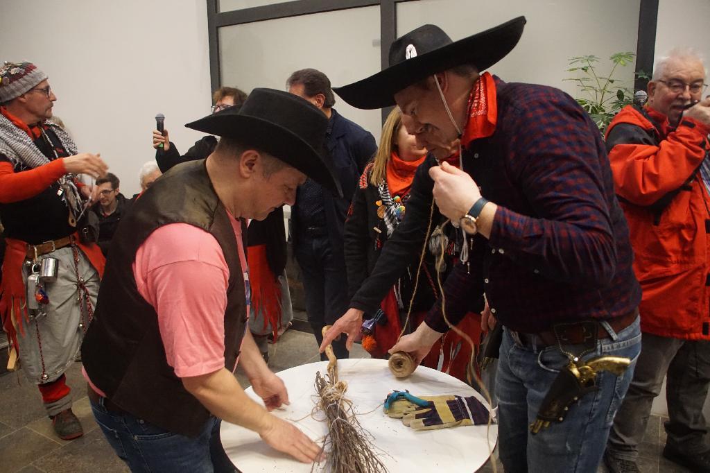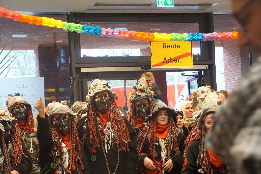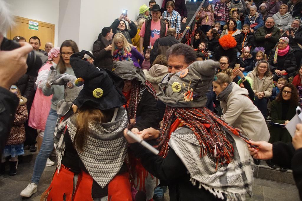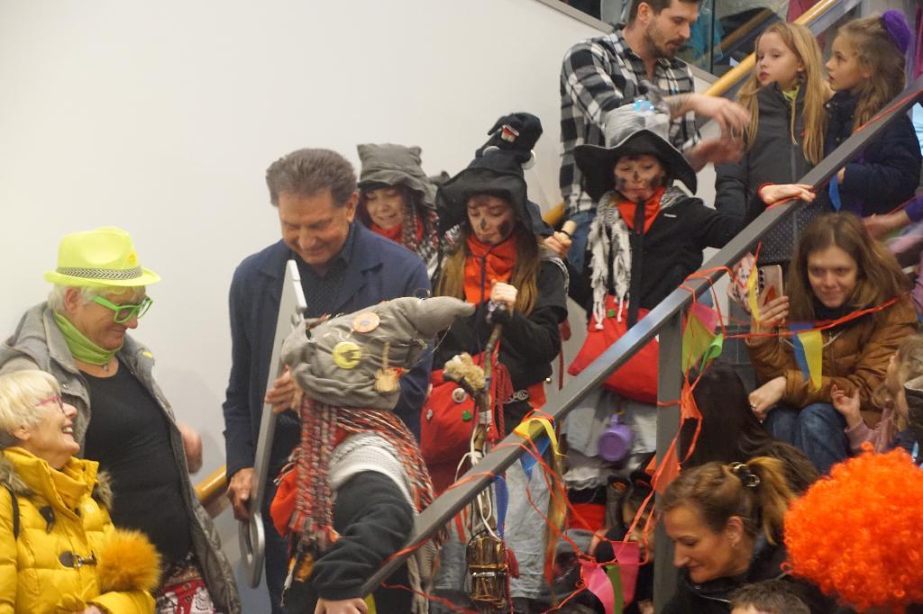 Leider hatte der Wettergott dieses Jahr der Veranstaltung auf dem Schlossplatz einen Strich durch die Rechnung gemacht, so dass sich das närrische Volk im Foyer des Rathauses zusammendrängen musste. Nichts desto trotz waren neben dem obligatischen Schnäpsle mit Oberhexe Gabi wieder Aufgaben, wie Hexenbesenbinden von den Mitarbeiterinnen und Mitarbeitern zu erfüllen. Dank der musikalischen Unterstützung der Spindel Fetza und der Bewirtung durch die Eislinger Feuerwehr war der närrsiche Nachmittag trotz Wetterkapriolen wieder ein voller Erfolg.