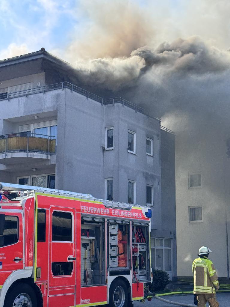 Die Ausbreitung des Feuers erfolgte über die Konstruktion zwischen Balkon, Dachbereich und angrenzenden Wohnungen. Die genaue Brandursache ist Gegenstand der polizeilichen Ermittlungen. Aufgrund des dynamischen Brandverlaufes und Hinweisen auf eine Person, die sich im Inneren des Gebäudes im unmittelbaren Gefahrenbereich befinden könnte, wurde das Aufgebot an Rettungskräften auf Seiten der Feuerwehr und des Rettungsdienstes vorsorglich und frühzeitig erhöht. Die Feuerwehr bekämpfte den Brand über zwei Drehleitern sowie über mehrere handgeführte Strahlrohe im Innen- und Außenangriff. Zusätzlich wurden Fachberater hinzugezogen, um die Stabilität des stark beschädigten Daches zu beurteilen und Sicherungsmaßnahmen einzuleiten. Die Nachlöscharbeiten dauerten bis kurz nach Mitternacht an. Das Gebäude ist derzeit nicht mehr bewohnbar. Während die Dachgeschosswohnungen vollständig zerstört wurden, entstanden in den darunterliegenden Stockwerken erhebliche Schäden durch Löschwasser. Glücklicherweise bestätigte sich der Verdacht auf eine vermisste Person im Inneren des Gebäudes nicht. Alle Bewohner konnten das Haus sicher verlassen. Insgesamt waren rund 100 Einsatzkräfte mit etwa 35 Fahrzeugen im Einsatz. Angefordert wurden mit jeweils unterschiedlichen Fahrzeugen die Feuerwehren aus Göppingen, Salach, Süßen und Ebersbach. Ebenso vor Ort war der Regelrettungsdienst mit den DRK Ortsverbänden, die Landespolizei, das THW Göppingen, Fachberater Bau/Statik, die Notfallseelsorge, Vertreter der Stadtverwaltung Eislingen sowie der Betriebshof der Stadt Eislingen.
