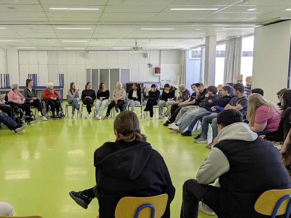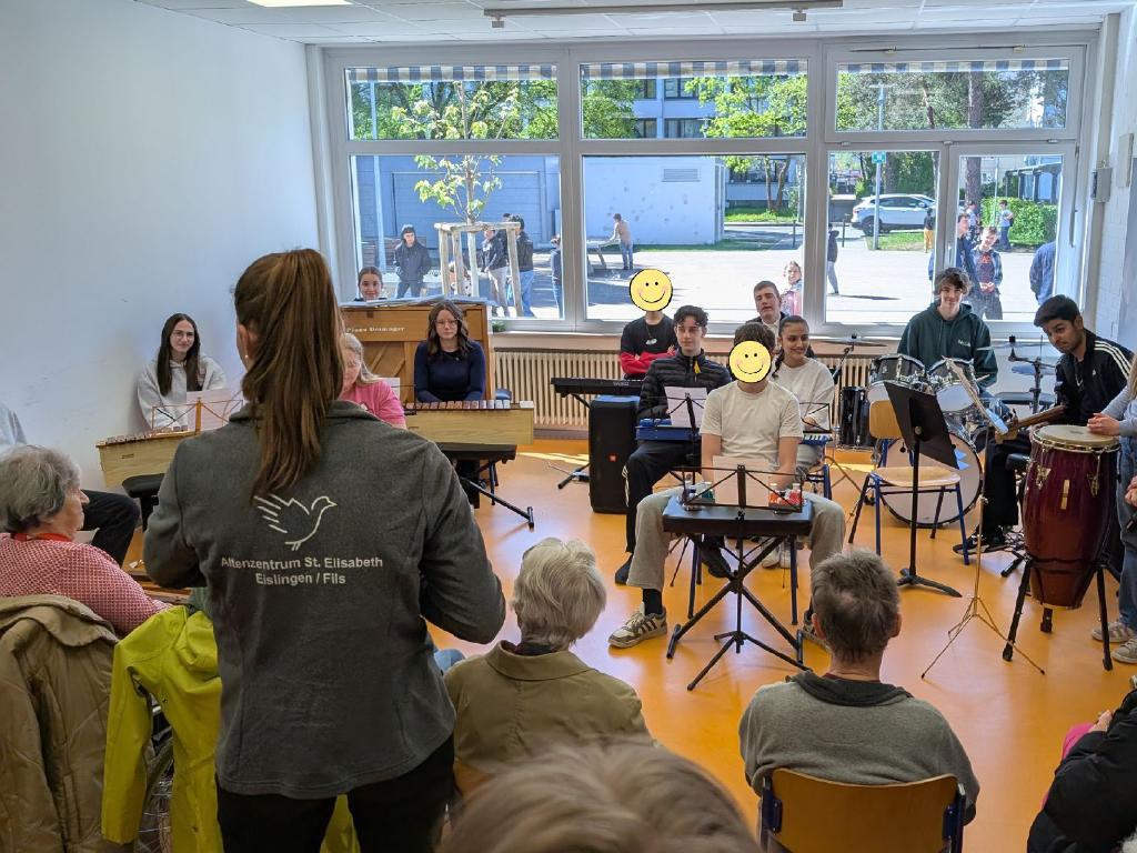 Im Anschluss wurde gemeinsam gelacht und gerätselt: Ein Memory-Spiel mit der gesamten Klasse brachte alle Beteiligten näher zusammen und sorgte für eine lockere, fröhliche Atmosphäre. Den gelungenen Abschluss bildete ein kleines Konzert der 10. Klasse. Eine Schülerband präsentierte den Song 'High Hopes'und begeisterte das Publikum mit ihrer musikalischen Darbietung. Für die Bewohnerinnen und Bewohner war dieser Vormittag eine rundum gelungene Erfahrung.
