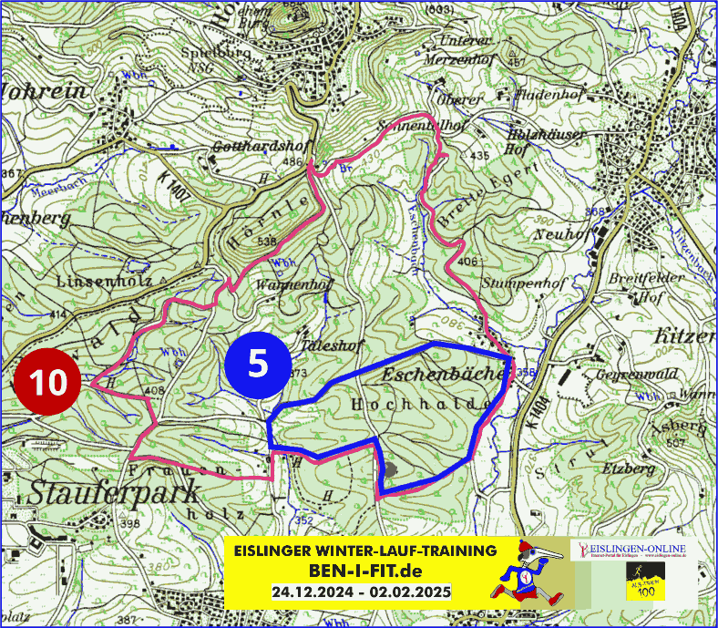Beide Strecken starten am Wanderparkplatz im Brentenholz und führen meist über Waldwege unterhalb des Hohenstaufen.