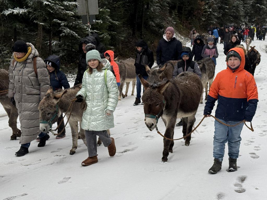 Mit insgesamt 15 Eseln machte sich die Gruppe auf eine zweistündige Wanderung, die sie in einem weiten Bogen über den Wolfgangsee Adelberg und schließlich zurück zur Zachersmühle führte. Die vierbeinigen Begleiter erwiesen sich dabei als ausgesprochen gesellige Wanderkameraden. Manche schienen regelrecht Gefallen daran zu finden, sich mit ihren menschlichen Partnern über die neuesten Vereinsgeschichten auszutauschen – zumindest ließen ihre neugierigen Blicke und ihr gemächliches Schlurfen dies vermuten. Doch je näher man dem Ausgangspunkt kam, desto deutlicher veränderte sich das Tempo. Plötzlich entwickelten die sonst so gemütlichen Esel eine erstaunliche Dynamik. Ihre Schritte wurden länger, die Ohren wippten entschlossen nach vorne, und man konnte sich des Eindrucks nicht erwehren, dass die Tiere genau wussten, wo es warmes Heu und ein gemütlicher Stall gab. Wer nicht aufpasste, fand sich schneller im Trab wieder, als ihm lieb war – sehr zur Belustigung der übrigen Wandernden.