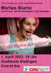Marlies Blume ist die Frau, die nicht ein bißchen Frieden will, sondern das große Ganze fordert, und das in einer Sprache, die jeder versteht: „I will Frida!“. Könnte etwas besser zur CDU Eislingen passen?! Auf Einladung der Christdemokraten in der Filstalemtropole wird sie daher bei deren Jahresempfang am 1. April im Kronensaal der Eislinger Stadthalle einen augenzwinkernden Blick auf Zei...